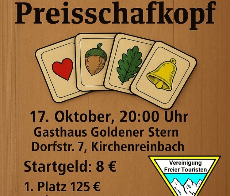 Schafkopf „Kurzer“Interne Vereinsveranstaltung, Öffentliche Veranstaltung Wann 17/10/2025 20:00 - 22:00 Zum Kalender hinzufügen ICS herunterladen Google Kalender iCalendar Office 365 Outlook Live Veranstaltungstyp Interne Vereinsveranstaltung Öffentliche Veranstaltung